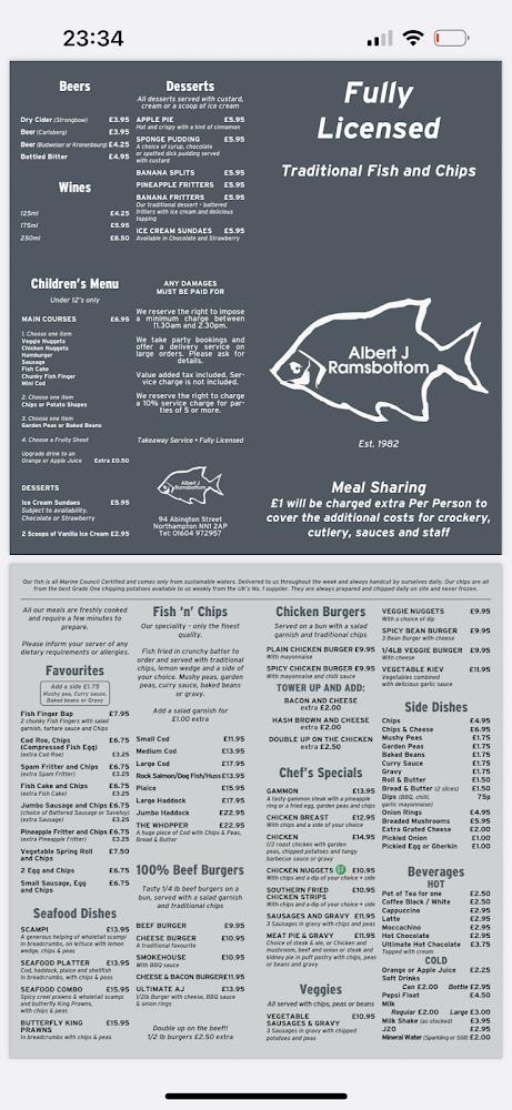Nestled on Abington Street, Albert J Ramsbottom is a celebrated fish and chips restaurant, renowned for its inviting atmosphere and scrumptious menu offerings. This eatery is not just a place to grab a quick bite; it embodies the spirit of traditional British dining. Whether you choose to dine in with family or opt for takeaway, the service is always prompt and friendly. The location is easily accessible, with wheelchair-friendly entrances and seating available, ensuring comfort for all guests.